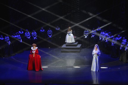 И вот в этом месте нашей статьи уместно будет обещанное размышление по поводу жанров. Официальное наименование увиденного нами спектакля, напомним, «современная опера». Обычно под этим термином сейчас понимается нечто, вроде произведений Сергея Невского, Бориса Филановского и других их единомышленников, западных и отечественных, – атонально-звукоимитационная партитура плюс шоковый перформанс. К этому направлению «Две королевы» не имеют вообще никакого отношения, равно как и к традиционной опере, предполагающей пение без микрофонов и достаточно строгую, выверенную вокализацию. Является ли произведение мюзиклом – тоже большой вопрос, по преобладающей музыкальной стилистике, возможно, и да. Но мюзикл тоже предполагает очень тщательное отношение к вокалу, в нем от артиста требуется не просто поставленный эстрадно-джазовый голос, с точным интонированием, но и чувство ритма, хорошая дикция, актерское мастерство, пластика и хореография. А главное, общий посыл мюзикла другой – это бодрое, легкое и позитивное действо, это шоу, задача которого – так или иначе развлекать, а не грузить отрицательными эмоциями, вспоминаниями учебника истории и прочими мыслительными усилиями. Еще в большей мере «легким жанром» является оперетта, хотя ее и поют под полноценный симфонический оркестр…
