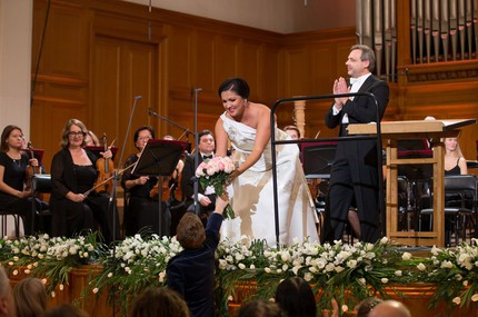 В то время как сопрано и тенор предлагали публике, как ни крути, оперные вокальные миниатюры, Екатерина Губанова решила положить слушателей на обе лопатки с помощью монументальных оперных арий. Сначала прозвучала ария Леоноры «Fia dunque vero, oh ciel? … O mio Fernando» из «Фаворитки» Доницетти, а затем – ария Иоанны «Да, час настал!» из «Орлеанской девы» Чайковского. Но на количестве музыки без ее должного качества, соотносимого со стилистической адекватностью и эмоциональной глубиной образной интерпретации, – а именно этого качества исполнению и недоставало – отправить слушателя в нокаут невозможно. Ярко выраженной фактурой меццо-сопрано голос певицы никогда и не обладал, но даже его некогда «сопрановая яркость» сегодня уже окрашена однотонной матовостью. Что Леонора, что Иоанна, что русская опера, что итальянская (в данном случае была итальянская версия «Фаворитки»), – разницы не было никакой, а «пение нот», оставшись лишь вокальным эрзацем, «пением музыки» так и не стало …