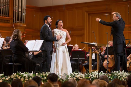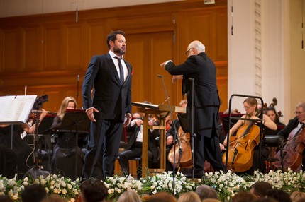 Буквально «перепев» Луку Сальси в дуэте Аттилы и Аэция (Эцио) из «Аттилы» Верди, настоящее итальянское бельканто раннего периода творчества композитора явил Ильдар Абдразаков. Не так давно в прошлом сезоне эту оперу он поставил в Уфе, спев в ней главную партию, а на концерте два политических противника Аттила и Аэций вступили в музыкальное противоборство вновь. Однако Италию наш русский бас Аттила итальянскому баритону Аэцию, как тот просит Аттилу в этом дуэте, не только не отдал, но даже не сдал и пяди завоеваний вокальной школы отечественных басов! По значимости этот большой развернутый дуэт, пожалуй, стал центральным номером всей программы. Думать так заставила и пресловутая доминировавшая в зале широкая публика, услышавшая эту музыку впервые в жизни и два раза пытавшаяся прервать исполнение аплодисментами в отчетливых паузах, искренне думая, что это уже финал…