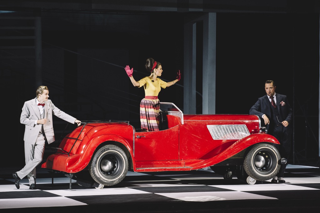 Контрастно-яркое пятно есть и во второй картине первого акта: это эффектный выход Норины, точнее, ее выезд на малиновом автомобиле в пространстве интерьера-экстерьера ее собственных «апартаментов», которое по сравнению с «апартаментами» Дона Паскуале сценографически никак не меняется. Первая картина – завязка, экспликация, и в ее начале мы видим Дона Паскуале и Малатесту, «поладивших» на предмет женитьбы первого. А ближе к ее финалу появляется и Эрнесто, который при известии, что дядя, отказывая ему в наследстве, решил жениться, да еще и на сестре Малатесты Софронии, чувствует себя и обманутым родственником, и преданным своим лучшим другом! И хотя вторая картина в опере принадлежит только двоим – Норине и Малетесте, – мимический антураж в нее в качестве аллегорического водителя авто вносит и Эрнесто, которого здесь как бы и нет и который о содержании важного разговора Малатесы и Норины, посвящаемой в дерзкий план доктора, еще пока не знает: «находка» режиссера не столь удачная, сколь забавная…