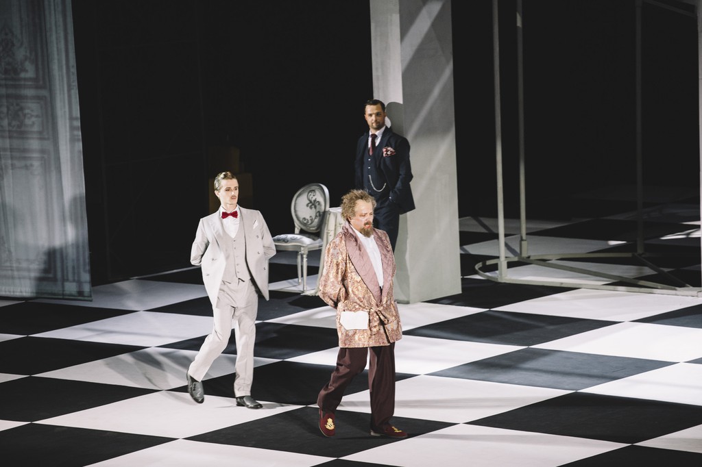 Вписать сюжет в современную реальность режиссеру помогает команда, в которую входят сценограф Пётр Окунев, художник по костюмам Елена Бадмаева, художник по свету Иван Никитин и режиссер видеоконтента Вадим Дуленко. Сценография – сквозная, одна и та же на все три акта (с антрактом после второго). Двухуровневая абстрактная конструкция сочетает в себе как черты интерьера, так и черты экстерьера. Ее остов – сам планшет сцены, игровое «шахматное поле» в черно-белую клетку. С верхней галереей оно соединяется весьма широкой «спиралеобразной» лестницей. К лестничной конструкции – к конструктивистскому «лесу» из ступенек – на двух уровнях «актерского обитания» по ходу спектакля прилагается и необходимый мебельный реквизит «для сидения», а на флангах возникают абстрактно функциональные ширмочки-кулисы, словно обозначающие большой проекционный экран на заднике, проступающий сквозь «лес» сценографических ступенек.