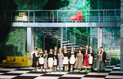 Похоже, экран – главная фишка постановки, ведь в зрительской программке заботливо выписаны названия известных фильмов, фрагменты из которых возникают на нём как фон. Преобладает неоклассика Федерико Феллини («Сладкая жизнь», «Ночи Кабирии», «Рим»), но есть и эротика от Тинто Брасса («Все леди делают это»), и американская «сказка» от Уильяма Уайлера («Римские каникулы»), и ее итальянский ремейк «Безумно влюбленный» от режиссерского дуэтного бренда Castellano e Pipolo. Постепенно фоновое «кино» из черно-белого превращается в цветное, а в декоре изначально серых ширмочек-кулис вдруг наивно начинают проступать яркие, веселые краски. Это вполне коррелирует с переменами в доме Дона Паскуале, ведь после «свадьбы» запросы Софронии-Норины с прицелом на расточительство, великолепие и роскошь достигают, в конце концов, своего апогея.