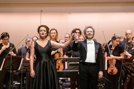 В начале второго отделения градус романтических страстей поднялся еще немного: прозвучали прелюдия к третьему акту и большая сцена Шарлотты с письмами «Werther! Werther!» из оперы Массне «Вертер». После этого с изумительно красивой и чувственной арией обольщения – арией Далилы «Mon cœur s’ouvre à ta voix» из оперы Сен-Санса «Самсон и Далила» – наступила неспешная, пленительно обволакивавшая слух релаксация: под пение Клементин Марген мы словно погрузились в медитацию, подсознанием «улетев» далеко за пределы концертного зала, но прозвучавшее следом вступление к опере «Пиковая дама» Чайковского явилось довольно рельефным «съездом» в сторону русской музыки.