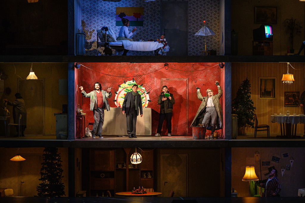 Спектакль «Богема», состоявшийся 22 ноября в Гамбургской опере, ничего нового мне лично в этом произведении не открыл. Это постановку осуществили режиссёр Ги Йостен и сценограф Йоханнес Лайакер. Они решили представить на сцене жизнь современной немецкой богемы и малоимущих слоёв населения – получателей печально известного пособия по безработице Hаrtz IV. И сегодня представители творческих специальностей – художники, фотографы и проч. – испытывают в Германии большие материальные трудности – об этом рассказывает одна из размещённых в буклете статей.