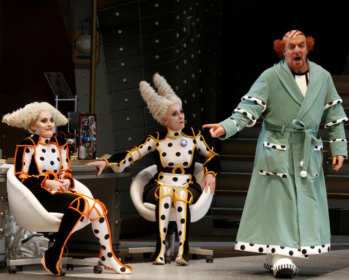 Понятно, что если пришли настолько масштабные идеи и всех действующих лиц так основательно запаковали в поролоновые костюмы, то с драматургией и разработкой каких-то там мизансцен можно было не заморачиваться. Cпектакль представляет собой, по сути, концертное исполнение. Не поставлен дуэт Анжелины и дона Рамиро в первой картине, ария дона Маньифико во втором акте, и проч. Общую статичность этой картонной постановки оживляют роботы — ездят на роликах, работают парикмахерами.