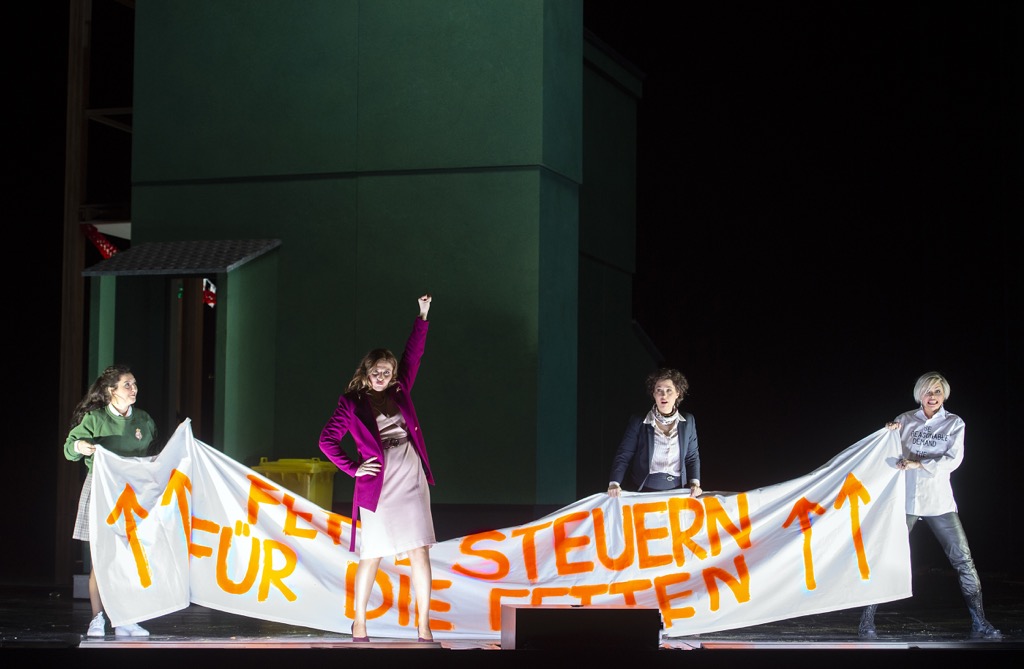 Сквозь общий режиссёрский мусор просвечивала генеральная идея постановки: в современном обществе женщины обрели власть и злоупотребляют ей, унижая мужчин. И дело не в том, хороша или плоха эта концепция и насколько она подходит к «Фальстафу», а в том, что у Биейто нет таланта и режиссёрской ловкости для того, чтобы её реализовать. Как раз «Фальстаф» требует разработанной драматургии, там нельзя просто стоять и держать растяжку с надписью «Жирные налоги для жирных людей», поднимать сжатый кулак или кое-как пританцовывать под музыку, потому что больше нечем заняться.
