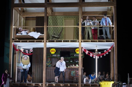 Дирижировал Аксель Кобер, и под его осторожным руководством солнце музыки Верди над навозной кучей этой постановки воссияло не слишком ярко.