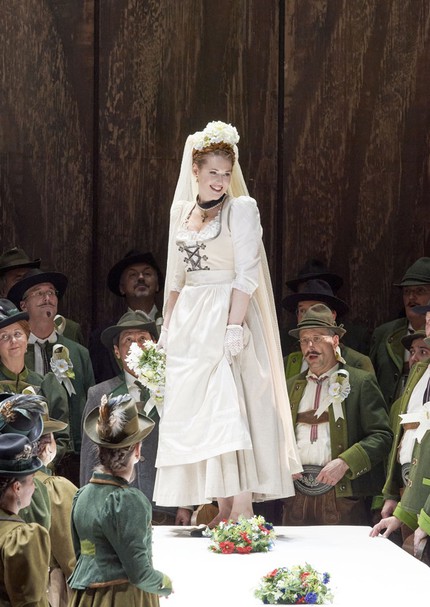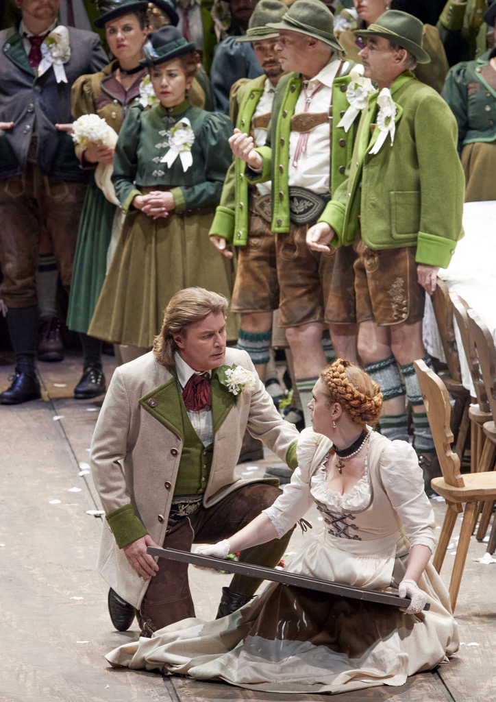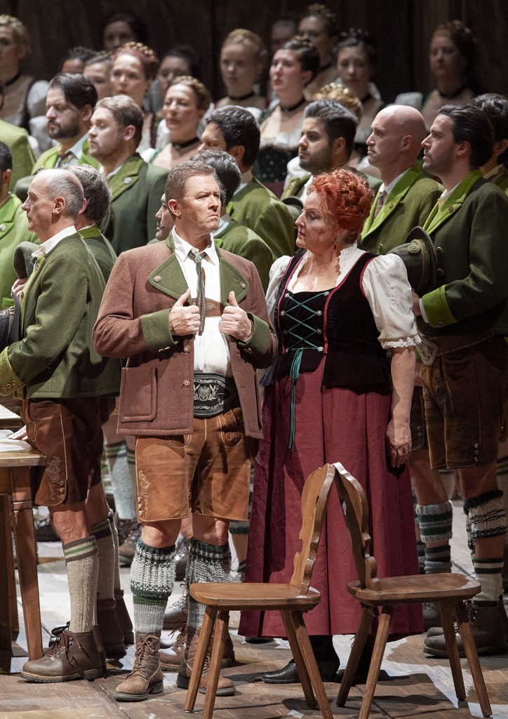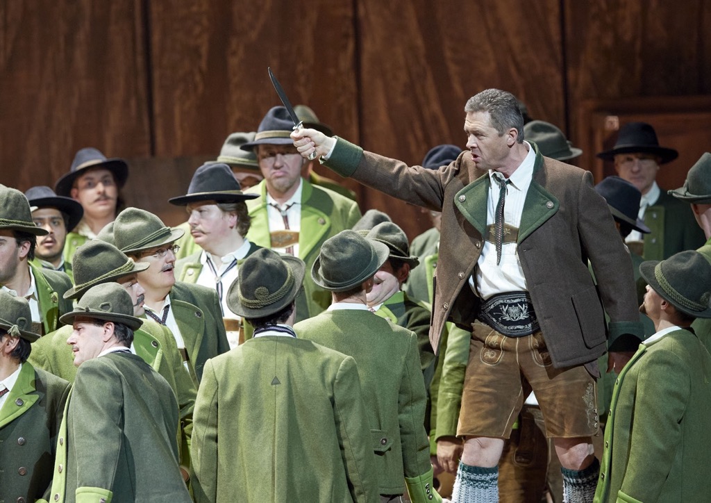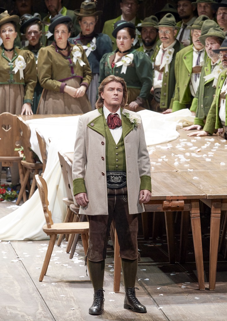 В своем спектакле Андреас Хомоки идет по пути вполне реалистичной абстракции, причем – абстракции довольно «живописной» по нынешним временам тотального «мрака», окутавшего «режиссерскую оперу». Он локализует действие в маленьком замкнутом мирке затерявшейся где-то в Альпах немецкой деревушки XIX века (возможно, начала XX века), создавая ее модель-проекцию, уменьшенную в границах «деревянной» коробки сцены. Он взывает не к романтическому пафосу, не к плакатно выстроенной легендарно-исторической образности, а к языку, созвучному опыту жизни публики в зале. Мистическую историю подлога и обмана он рассказывает в наивно простой и довольно банальной эстетике «здесь и сейчас», не отягощая сюжет бытовизмами и вовлекая в него лишь минимальный набор мебельного реквизита из столов и стульев, способных служить разным сценографическим задачам в пределах одного и того же антуража, распространенного на три действия оперы.