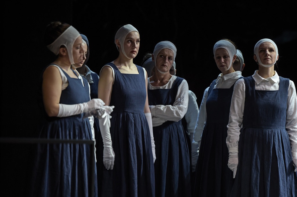 Ким также продемонстрировала нам размах своей фантазии тем, что сама придумала кое-какие ритуальные действия — женщины держат во рту листы бумаги и одновременно пускают световые блики кухонными тесаками. Она активно использовала и мой любимый режиссёрский приём – пение дуэтом на фоне занавеса. Какую-то важную символическую роль в спектакле играет мешок с мусором.