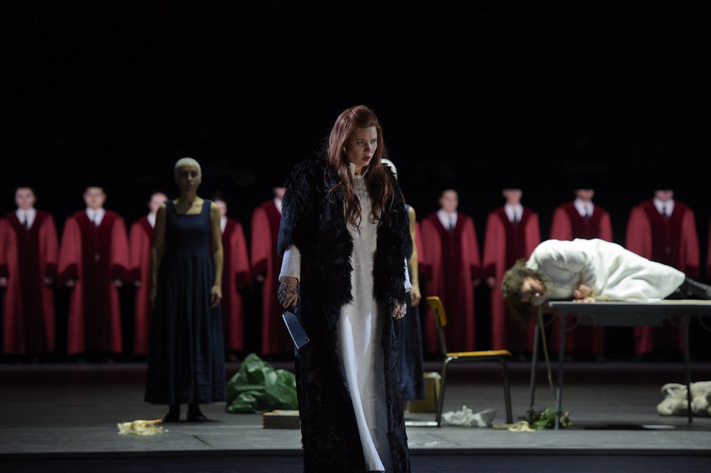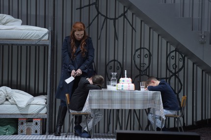 Поэтому у Нормы в спектакле рыжие волосы. С этими огненными волосами она мечется в металлическом бункере, спрятанном в цифровом чёрном лесу; в подземном отделении живут её сыновья. Норма подмешивает им снотворное в зелёный лимонад. Сценический разворот немного напоминает историю фрау Геббельс (отравившей в бункере своих шестерых детей).