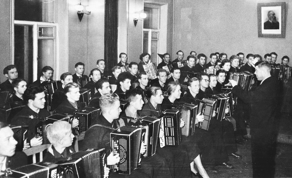 Оркестр баянистов и аккордеонистов Музыкальной школы для взрослых им. Н. А. Римского-Корсакова под руководством П. И. Смирнова (Ленинград, 1957)