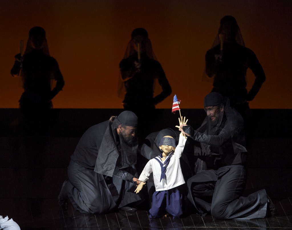 Бедная девочка Чио-Чио-cан как новая игрушка военного моряка Пинкертона, который, не стесняясь, называет её куклой (отсюда, к слову, очень тонкое использование кукол в спектакле), становится тем самым феминистским манифестом, который в классических постановках, как правило, не звучит. В спектакле Мингеллы, в его сценографических и мизансценных диагоналях нарочито прочерчивается противопоставление Пинкертона, не способного посмотреть в глаза матери своего ребёнка, и мужественной девушки-самурайки.