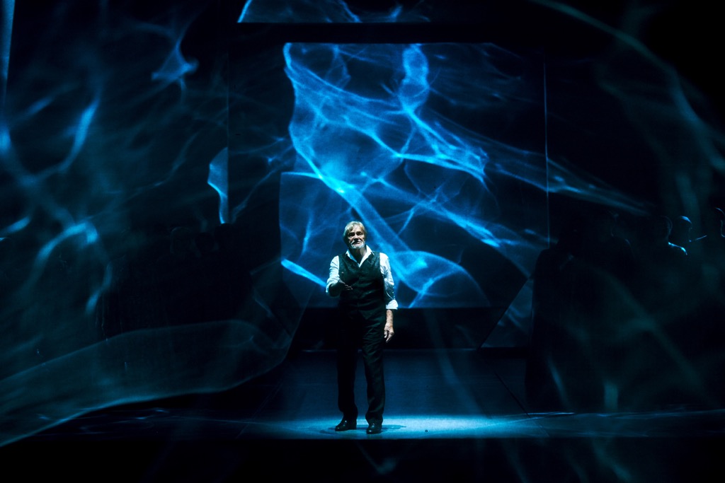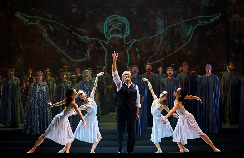 «Сценография вечности», заговорившая в спектакле посредством световых решений Айвара Салихова, насквозь пропитана не менее говорящей и действенной компьютерной графикой Эрика Исламова. Ее художественный контент – живописные работы Владимира Васильева, а сам он, словно сценический дирижер всего ансамбля артистов – хора, певцов-солистов, артистов и солистов балета, – часть спектакля, точнее – его интеллектуальное ядро. Васильев-живописец изящно проступает в сценографических артефактах, Васильев-поэт – в собственных стихах, которые читает со сцены, вплетая поразительно тонкую, но живую нить в музыкально-драматическую и пластико-хореографическую канву спектакля. А это, в свою очередь, заставляет говорить о Васильеве-артисте, который своим замыслом смог увлечь крепкую команду профессионалов-единомышленников.