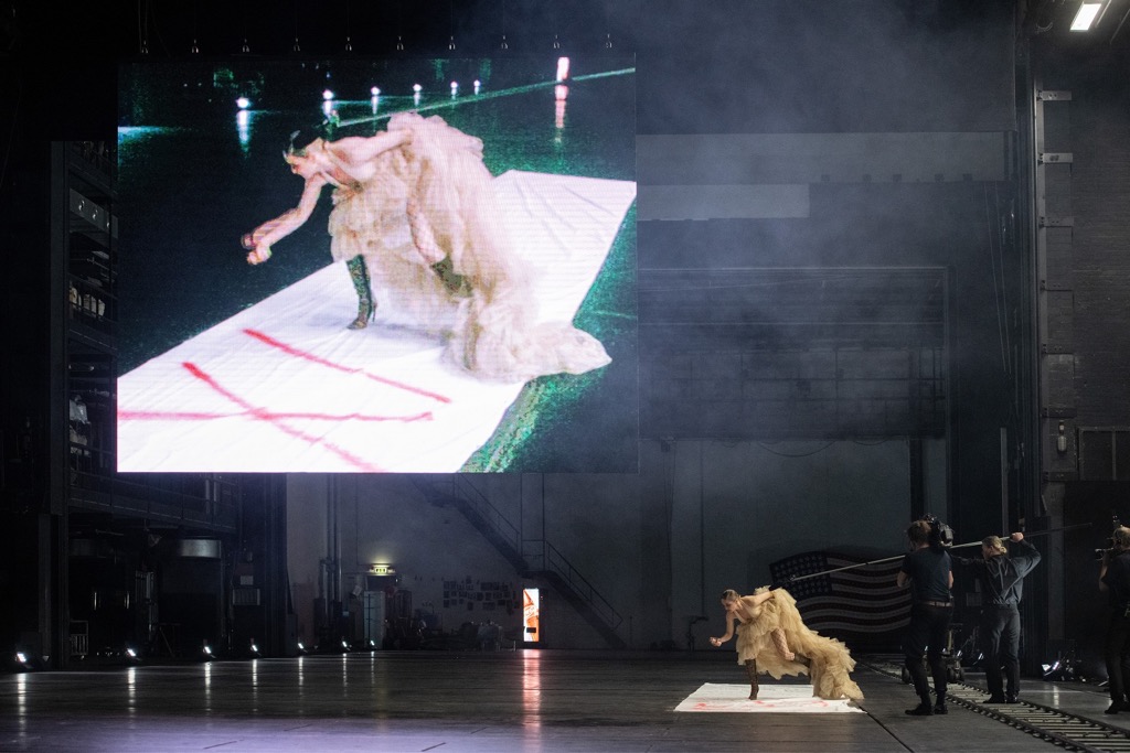 В этом спектакле больше всего раздражает практически полное отсутствие живого контакта с исполнителями. Сцену «продлили» до предела, она превратилась в освещённый по сторонам снизу широкий туннель, по которому навстречу зрителями долго выходят артисты. Сверху находится экран для демонстрации параллельно снимаемых на камеру лиц, мультфильмов и отрывков из фильма Квентина Тарантино «Бешеные псы». Освещение слепит глаза, а от экранов уже, казалось бы, все устали за время карантина. Какой смысл покупать билет в наконец-то открывшийся театр для просмотра «Бешеных псов»? Непонятно, зачем на сцене дублировать такие реалии коронавирусного кризиса как дистанция и опосредованность — они и так на виду.
