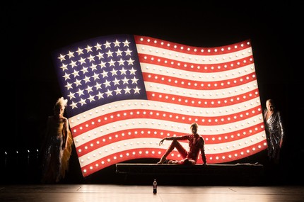 Спектакль открывается «Прибытием царицы Савской» из оратории Генделя «Соломон». В это время рыжая кудрявая девушка танцует с американским флагом.