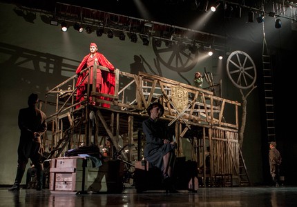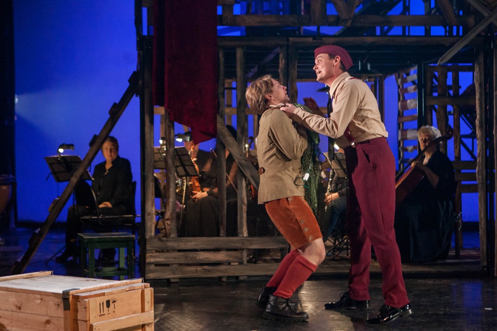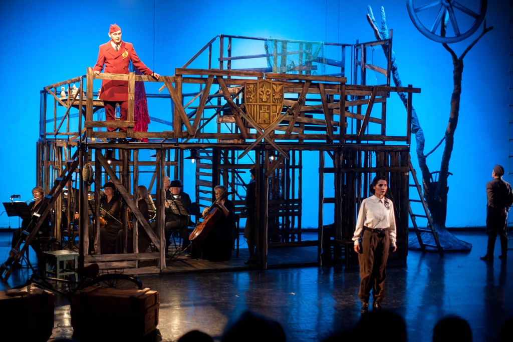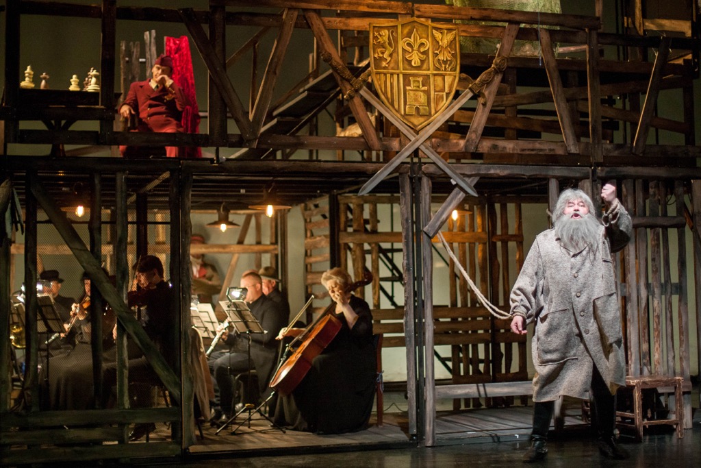 Теперь центром твоего зрительского мироздания предстает каркасный павильон из деревянных жердей, крыша которого – балкон с геральдическим символом. По-видимому, это и есть королевский династический герб. Но на балконе имеется и необходимый по сюжету шахматный стол с расставленными на нём фигурами, и так как игра в шахматы – досуг явно не крестьянский, то и в этой детали также угадывается намек на дворец Короля. Однако «бастион» из жердей универсален: по мере развития сюжета он служит разным его локализациям – как королевским, так и народно-крестьянским. А деревянная конструкция словно вросла в разделенный надвое оркестр, пустив свои корни, словно живое дерево, в музыкальное измерение жизненной фабулы незатейливо умной взрослой сказки.
