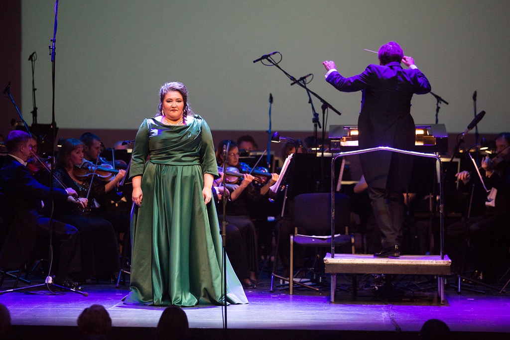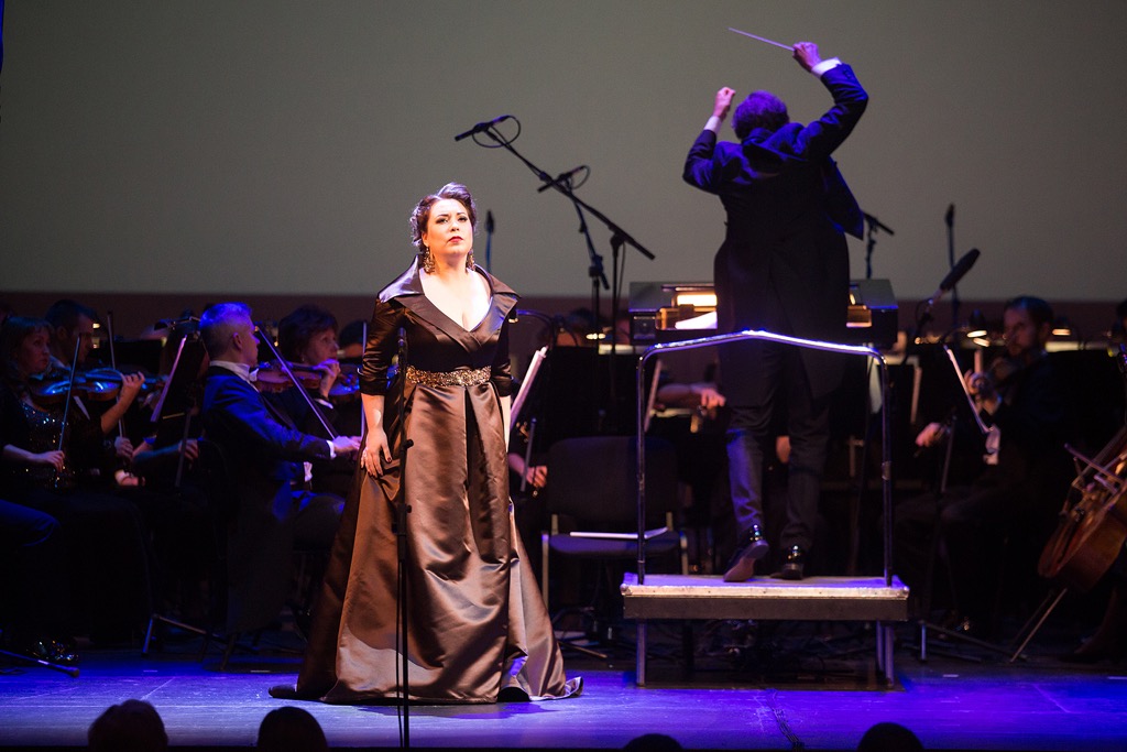 Названный вагнеровский дуэт прозвучал совместно с солистом Мариинского театра, бас-баритоном Евгением Никитиным, а вердиевский дуэт – с меццо-сопрано Екатериной Губановой, исполнительская карьера которой в последние годы связана преимущественно с зарубежными оперными сценами. Оба исполнителя – лауреаты премии CASTA DIVA в номинации «Певец / Певица года», и сольно Евгений Никитин провел выходной монолог Голландца «Die Frist ist um, und abermals verstrichen sind sieben Jahr’», но психологически тонкой музыкальной выделкой и теплом романтической ауры, присущей страдающей душе своего персонажа, захватить так и не смог. Басовая зычная напористость создавала полотно суровой плотной фактуры, и тонких чувственных нитей в нём, увы, попросту не оказалось. Собственно, это повторилось затем и в дуэте певца с Еленой Стихиной.