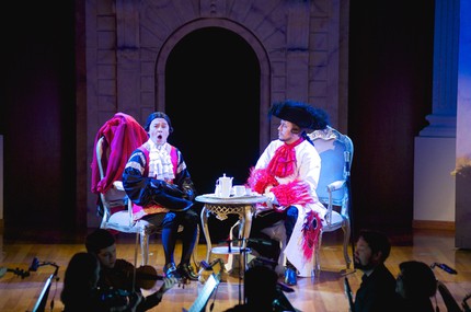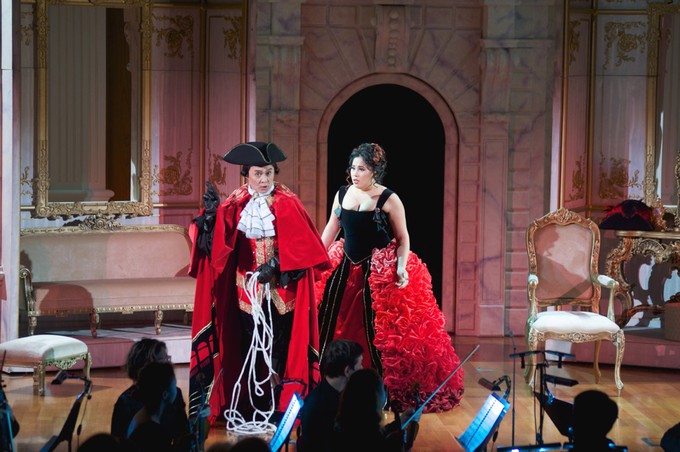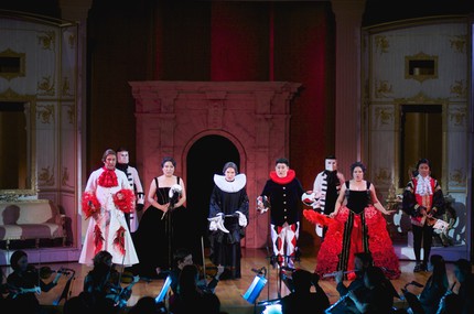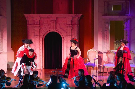В результате им удалось создать прелестный карнавальный спектакль в semi-stage формате, который для эстетики комического фарса оказался абсолютно самодостаточным. Уже сам декоративный антураж сцены Камерного зала в форме подиума, у которого нет кулис, но есть проход в центре вогнутого задника и подъемы-проходы с обоих флангов, абсолютно дружествен для создания на этой сцене постановок подобного камерного толка. Оркестровой ямы в Камерном зале нет, однако это не беда: небольшой по составу оркестр вполне органично вписался в зазор между подиумом и первым рядом зрительских кресел.