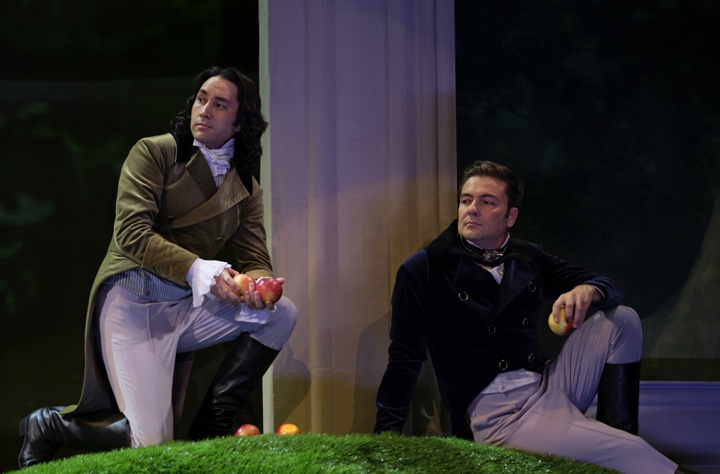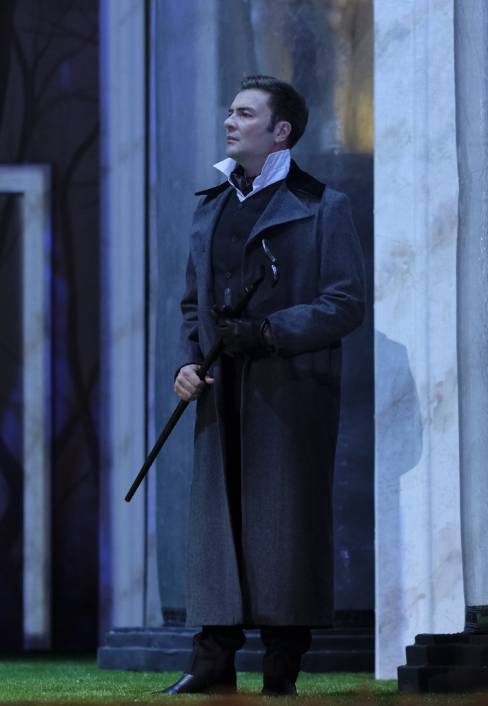 Весь ансамбль певцов – прекрасные артисты, и при крупноплановой подаче их игры на трансляционном экране это видно особенно отчетливо. Специфически харáктерная партия Дормона невелика, однако в контексте ее задач тенор Руслан Совет вызывает в ней полное доверие. Джермано – герой особый, персонаж buffo, и коль скоро он слуга у Дормона, то его так и хочется назвать персонажем служебным. Но это совсем не так: он очень важный винтик сюжета, и это видно еще с интродукции, плавно переходящей в его дуэт с Джулией, а перед финалом у Джермано даже есть своя законная ария! И в этой благодатной партии баритон Азамат Желтыргузов необычайно органичен и как актер, и как певец.