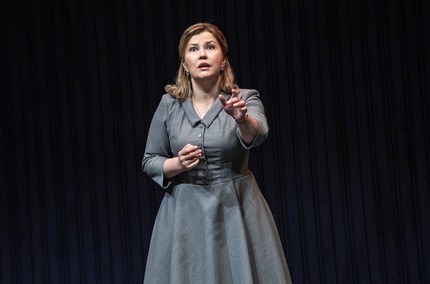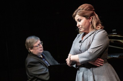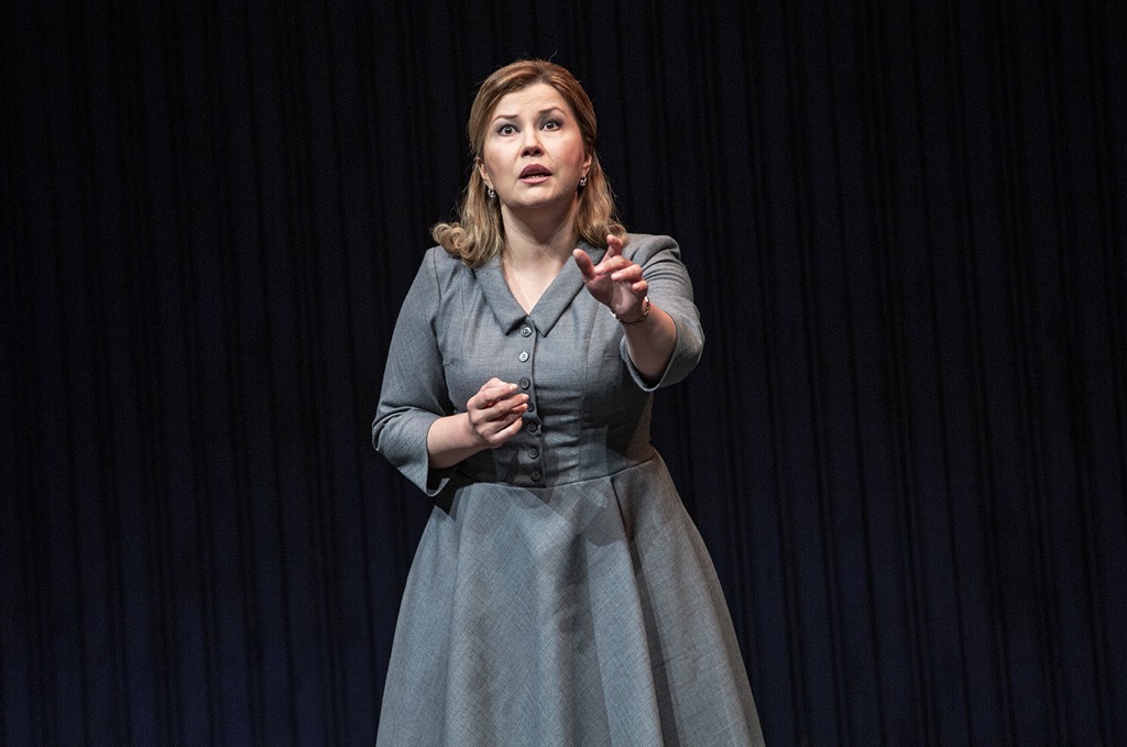 В традиции, ведущей отсчет от первой постановки Покровского, не слишком молодая, но всё еще привлекательная женщина, приходящая на свидание с возлюбленным раньше на полчаса – точнее, на 32 минуты – и в течение всего этого времени ведущая на публику свой внутренний сокровенный монолог, полный рельефных контрастов ее настроений, уходит в финале одна, так и не дождавшись желанного донжуана. Хеппи-энда нет и на этот раз, но, кажется, после крушения надежд на счастье любить и быть любимой наша героиня уходит не сломленной, а более мудрой и сильной. И «музыкальная терапия» по отношению к нам, слушателям, благодатна даже в избранном формате без аккомпанемента оркестра. Простая взволнованно чувственная мелодика, вложенная в уста героини, умиротворяет и лечит, заставляя задуматься над ее жизненной драмой и по-настоящему ей сопереживать.