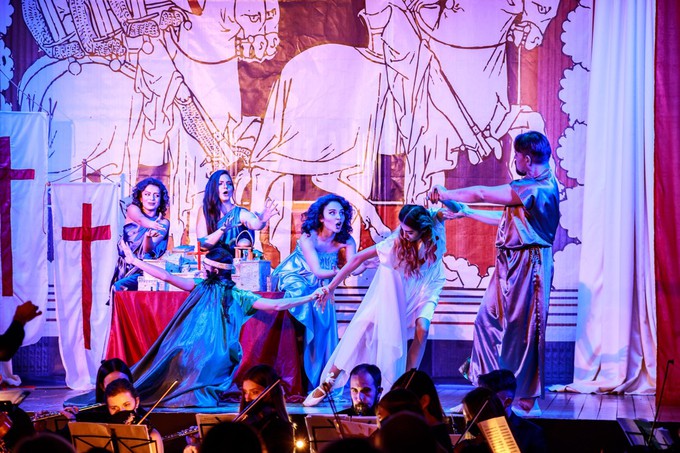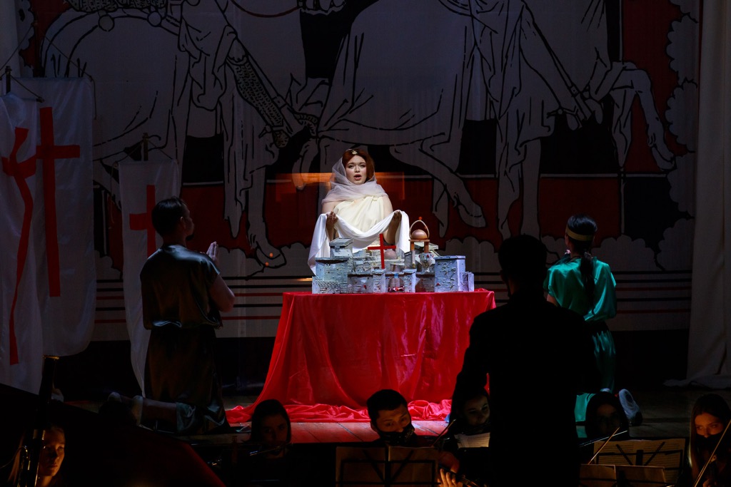 Мелкие намеки, режиссерские находки и «фишечки» – не только подходящий метод обучения стажеров тому, что им пригодится в будущем при работе над ролями, но это и по сути соответствует барокко как стилю – «выведение целого из деталей». Из запоминающихся деталей – алый христианский крест, прилепляющийся к рукам сарацина (и предвосхищающий его неизбежный переход в христианство в финале) или вздрагивающая от прикосновений к ранам героиня синхронно с мелизматикой пения (привет «Роделинде» и «Альцине» на сцене Большого театра). Альмирена призывает к освобождению практически в образе Богородицы с белым покрывалом над Иерусалимом, а христианский Маг-отшельник на коленях явно преемственен с образом Юродивого из «Бориса Годунова».