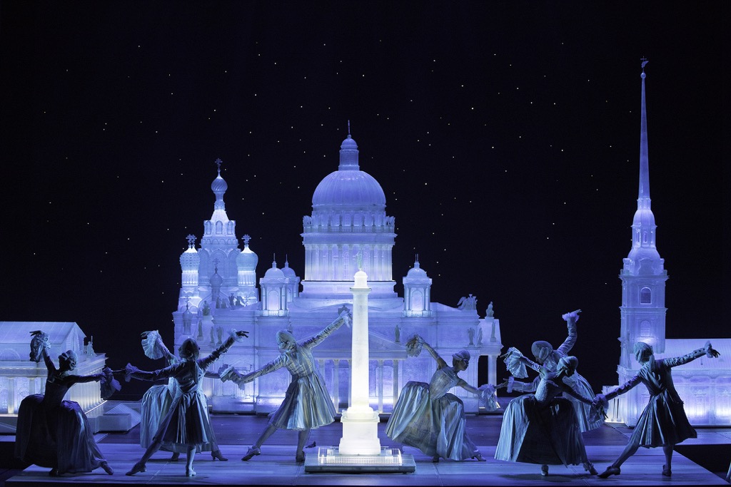 Алексей Франдетти в своём «Салтане» не стесняется делать праздник. Напротив, режиссёр настаивает на нём, никогда не скатываясь в дешёвый китч, даже когда речь заходит об укрупнении рискованного пушкинского противопоставления просвещённого «запада» острова Буяна, вырастающего на фоне звёздного неба хрустальными силуэтами петербургской архитектуры, и матрёшечно-лубочной Тьмутаракани.