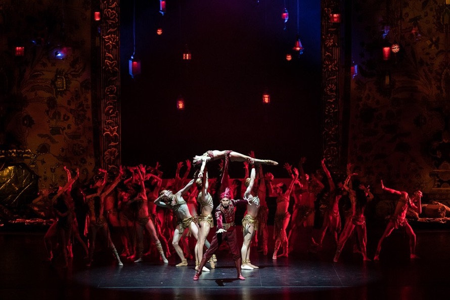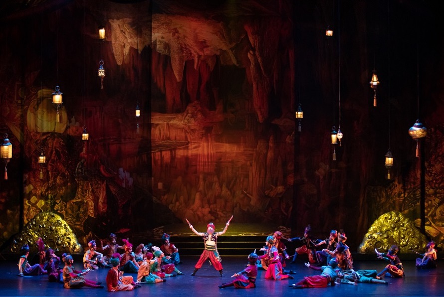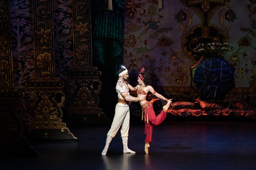 Превосходна по своей театральности сцена восточного базара: он полон красок, шума, веселья, обмана. Здесь и торговцы фруктами и всякой всячиной, и вельможа, покупающий наложниц. Появляется Принцесса Будур (Анастасия Балуда), и все падают ниц. И только Аладдин (Гилерме Джунио) поднимает голову и смотрит на красавицу-принцессу. В сцене базара есть и динамика, и скорость, и юмор, и связующая плавность в танцах.