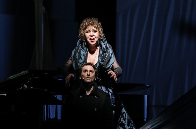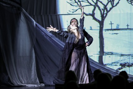 Космическим синкретизмом музыки Малера определяется и синкретизм театра. Он выстраивается на наших глазах как интеллектуально тонкий психологический этюд: черно-белая аллюзия здесь и сейчас на тему любви и смерти мощно захватывает выверенной с точностью до миллиметра графичностью мизансцен, хореографической пластики и сценографического антуража. Ничего лишнего на сцене нет, но всё самодостаточно. Сцену разделяет пополам черно-белая конструкция, похожая на парус, черная стрела которого «выстреливает» под колосники в полном созвучии с трагичностью сюжетного момента. Основание сей легкой, но кажущейся фундаментальной конструкции ассоциируется еще и с семейным очагом – с домом, в который пришла беда, с домом, в котором когда-то было не только одно лишь черное, но и белое. Слева от «очага-паруса» – черный рояль, арфа, исполнители-инструменталисты и певица-солистка, которая на правах Музы этого дома наполняет его не только светом радости, но и скорбью — светом печали и утраченными, некогда счастливыми иллюзиями, то и дело возникающими в сознании обитателей дома.
