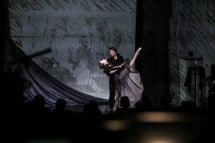 Автору этой идеи — режиссеру-постановщику Михаилу Елисееву — в действенном творческом тандеме с хореографом-постановщиком Марианной Рыжкиной, сценографом Ириной Долговой и дизайнером видеопроекционного ряда Анастасией Андреевой удалось, с позволения сказать, пройти сквозь стену чистой музыкальной абстракции так, что ее визуальные образы стали простыми и понятными, прозрачными и легко считываемыми. При оптимальном и весьма эффективном минимуме театрально-выразительных средств история тяжелых утрат, непростых отношений и проблемы одиночества двух любящих супругов (Он — артист театра и кино Владимир Кошевой, Она — артистка балета Марианна Рыжкина) предстает как музыкальное, хореографическое и драматическое действо, каждая составляющая которого важна наравне с другими.