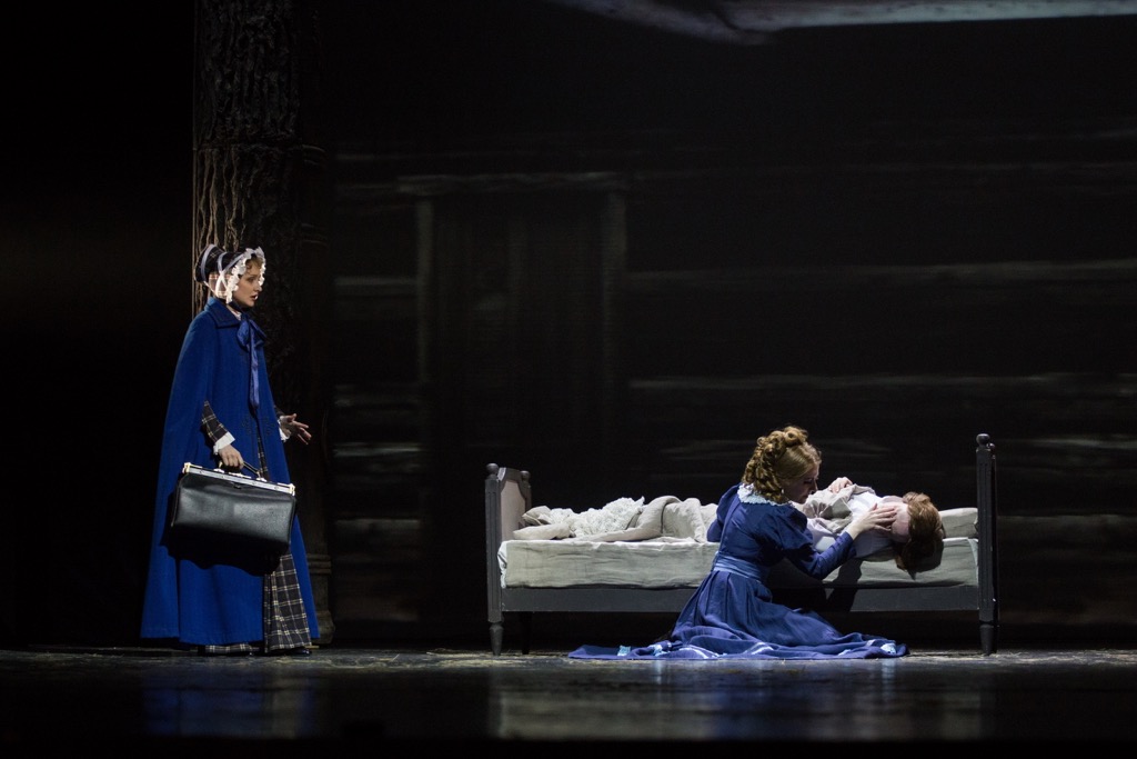 Есть в оформлении спектакля и современный элемент, причём он несёт в себе не только визуальный, но и эмоциональный посыл: в финале сгоревшая старинная деревянная церковь, которую несколько лет назад поджёг подросток в Кондопоге, в своей сценической видео-версии не сгорает, а уходит под воду. Видимо, это сделано по контрасту: раз уже есть бушующий пожар (горит подожжённый дом Лонсевиля), то церковь погибает, поглощенная водами озера.