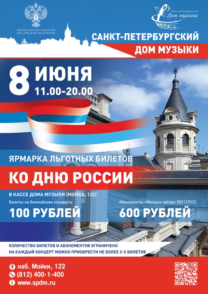 8 июня, во вторник, с 11.00 до 20.00, в кассе Санкт-Петербургского Дома музыки (Набережная реки Мойки, 122) пройдёт ярмарка льготных билетов, сообщила его пресс-служба. Все желающие смогут приобрести льготные билеты на заключительные концерты сезона по 100 рублей, а также абонементы «Музыка звёзд» следующего сезона за 600 рублей.