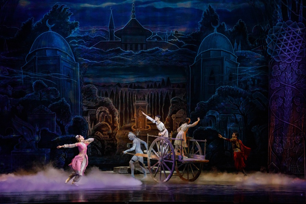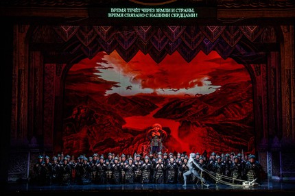 Дух хана Батыя (сына и преемника хана Джучи, основателя Золотой Орды) – такой же реальный персонаж балета, как и названные выше. Многочисленными мистическими интерлюдиями с его участием и детьми (маленькими Джанике и Нурадином) пронизан весь хореографический корпус обсуждаемого спектакля. Слой другого временнóго измерения в нужные моменты прозрачно совмещается с тем, что по ходу сюжета происходит здесь и сейчас. Пролог как раз и начинается с Духа хана Батыя, везущего Арбу судьбы некогда могущественной Золотой Орды, но этот прием естественно и органично также вписан во все шесть картин, что в недрах статичности, неизбежно присущей эстетике драмабалета, выигрышно создает ощущение целостности и довольно динамичного сквозного развития. И это притом, что в многогранном каскаде интереснейших – как сюжетообразующих, так и подчеркнуто жанровых – танцев, а также в массовых (особенно хоровых) сценах, не считая действенных танцевальных эпизодов, которые в балете также имеются, сквозное развитие сюжета неизбежно замирает, как во время исполнения арий в оперной постановке.