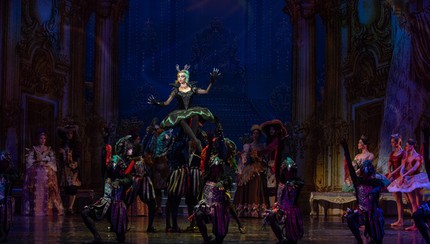 Спектакль производит впечатление невероятно стильной – музейной, но не нарочито «давящей» – помпезности в эстетике камзолов и париков от эпохи Людовика XIV (часть первая) до эпохи Людовика XVI (часть вторая). Но также рождается и мощное ощущение легкости, объема, воздушности, наполненности сцены флюидами сказочного волшебства. Это итог не только единой концепции балетмейстера и художника (сценографа и дизайнера костюмов), но также и «партитуры света», разыгранной как по нотам ее автором Сергеем Шевченко. Между тем, компактная действенность постановки предстает ее весьма важной и выигрышной стороной. Кроме этого кардинально переосмыслен и образ Феи Карабос. У Петипа она была харáктерным травести (горбатой старухой в исполнении танцовщика). На сей же раз партия злодейки в черной пачке и на пуантах поручена ведущей солистке: со свитой мрачного воронья она как раз и возникает в прологе. По мнению балетмейстера-постановщика, «феи не стареют и должны оставаться вечно юными, а зло не обязательно всегда уродливо, и именно поэтому Фея Карабос теперь также красива, как Фея Сирени».