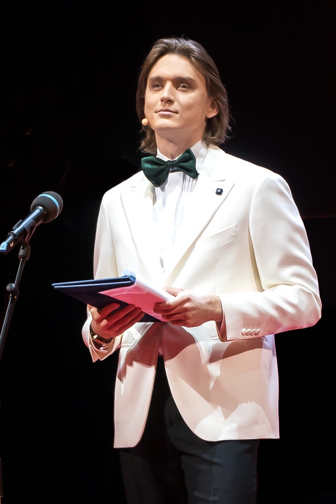 Из противоположных кулис выходят ведущие: в белом смокинге премьер Большого театра Денис Родькин, в роскошном вечернем туалете солистка Большого театра, актриса драматического театра и кино Анастасия Меськова. Царственная, она порадовала не только авантажной внешностью, но и способностью оторвать взгляд от сценария и вести вечер в прекрасной импровизационной манере, чего так не хватает подобным церемониям.