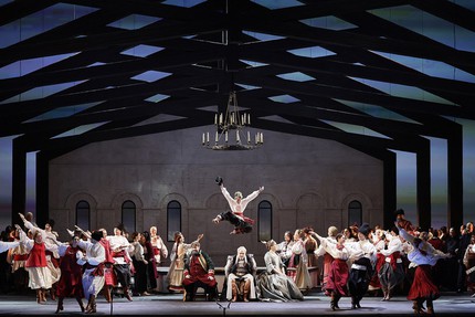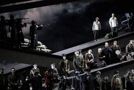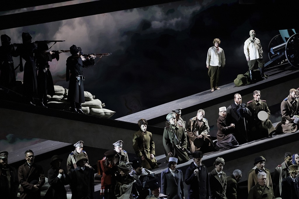 В этот «детский утренник», устраиваемый вечером для взрослой аудитории на главной музыкальной сцене страны, свой «игровой» вклад также вносят художник по свету Дамир Исмагилов, режиссер по пластике Албертс Альбертс и хореограф Ирина Кашуба. Танцы, поставленные ею в первом акте в украинском национальном стиле, начинаются с подиума, возведенного посреди сцены, и лишь затем лихо перетекают на авансцену концертного – не театрального! – пространства. Доминантой его на три акта оперы служит накрывающий всё происходящее на сцене дощатый каркас с навершием двускатной крыши, что, по мнению режиссера, создает абстрактный образ мирового дома (очага семьи). Дом по мере развития действия чернеет и разрушается, исчезая в воронке войны, но основополагающий тезис о том, что сюжетную коллизию оперы без войны не понять, абсолютно не состоятелен!