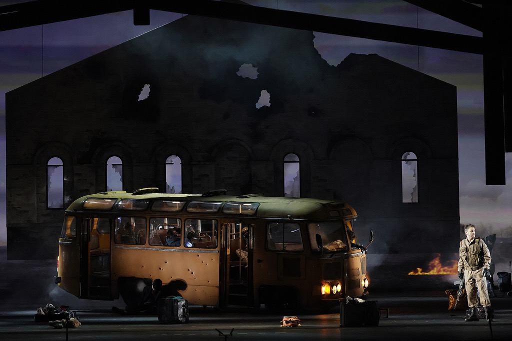 Первый акт – в исторических костюмах 1709 года, второй акт – эпоха Первой мировой войны. В симфоническом антракте «Полтавский бой» на большом проекционном экране-заднике Мазепа, сидя на табурете посреди пустой сцены, смотрит кинохронику ужасов Первой и Второй мировых войн, а шок третьего действия – расстрелянный военными (или террористами) автобус на фоне обгоревшего фасада хутора Кочубея. Каждая эпоха несет свой «гардероб», но абсолютно серая абстрактная сценография навевает скуку в каждом акте (даже в первом), ибо откровенно концертное пространство сцены с расставляемым в нём каждый раз новым театральным реквизитом ощущения театра не создает ни на гран. И если первый-второй акты еще можно было как-то принять и простить, то колыбельную Марии на фоне расстрелянного автобуса ни принять, ни простить невозможно! Перед нами разыгран абсолютно неуместный трагикомический фарс, однако «посмеяться» над ним в полной мере невозможно, ведь в душе – одна лишь боль из-за расправы над оперой…