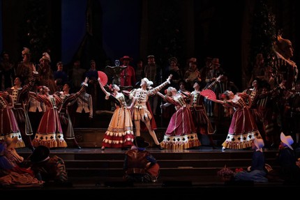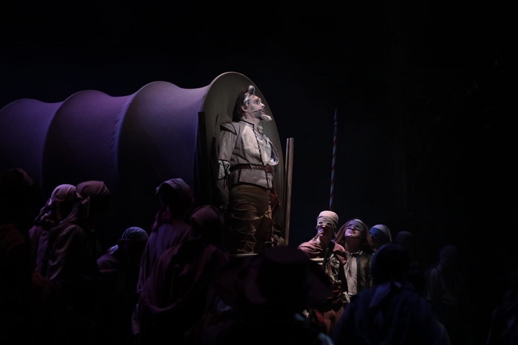 На явном музыкально-артистическом позитиве следует отметить и четверку праздных ухажеров Дульсинеи: Педро и Гарсиа (сопрано-травести) – Алина Латыпова и Гульнара Валеева, Родригес и Хуан (пара теноров) – Сергей Сидоров и Азамат Даутов. Разговор о музыкальном пласте, с которого, в силу его приоритетной важности, мы начали намеренно, на этом можно завершить, чтобы перейти, наконец, к аспектам режиссуры и сценографии. И тогда имя Аскара Абдразакова возникает вновь, ибо в этой постановке он показал себя не только прекрасным исполнителем, но и выступил как режиссер-постановщик, в команду которого вошли Иван Складчиков (сценограф, художник по костюмам и сорежиссер), Ирина Вторникова (художник по свету), а также Ирина Филиппова (хореограф).
