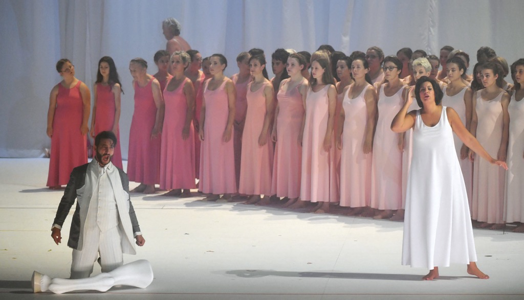 В предложенном же прочтении с добавленными инструментами (что странно, но допустимо), дописанными нотами (что вообще непонятно), фразами (что не очень понятно, но ситуативно приемлемо), мелодическими инкрустациями и фиоритурными инсталляциями мне видится не диалог с композитором, а попытка его переделывания. И тут сам собой возникает вопрос: неужели оригинальная партитура Моцарта так бледна, что нуждается в предложенном макияже? Замечу при этом, что к самому «макияжу» у меня претензий нет: так, например, неожиданно интересной показалась мне звуковая инсталляция в сцене на кладбище, капризно забуканная фестивальной публикой (уж к чему, а к этому чёрному пламени из «вспыхивающих» в нервной вибрации женских волос, претензии, на мой взгляд, предъявлять не за что). Но вот замена финального секстета на хор… Конечно, хор звучит эффектнее (возможно, ещё более эффектно он звучал бы в этом зале с балкона), но Моцарт написал секстет. У Моцарта была возможность закончить оперу хором. Но он её не использовал.