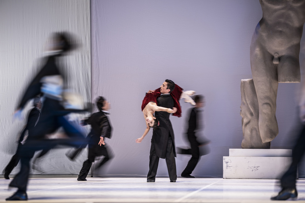 Для балетов Ноймайера характерены прологи в тишине. Здесь он заходит ещё дальше — представление начинается, когда зрители ещё только начинают собираться в зале. В уголке спит Эндимион (Аллессандро Фрола), изящно меняя сонные позы. Мужские и женские фигуры на голубом фоне создают атмосферу светлой весенней ночи.