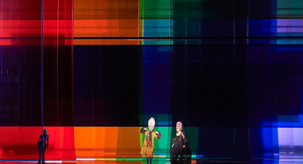 Между тем, несмотря на всю нелепую сценографию из настырного плексигласа и дурашливую пошловатость предложенной драматургии, ядром которой становится бесполое фиолетово-сиреневое дрыгающееся и мельтешащее существо-оживляж [1], я бы оценил новый спектакль как экстремально удачный, прежде всего, из-за блистательного ансамбля солистов и декоративной прелести предложенного режиссёром мизансценного макраме в сочетании с роскошными костюмами Виктории Бэр, прекрасно компенсирующими сценографическую несуразность. Фритч, конечно, сценограф никудышный, но режиссёр всё ещё выдающийся: невероятная живописность пластических характеристик, созданных постановщиком совместно с солистами, зачаровывает и пленяет. Освобождая сцену от малейшего намёка на реквизит, Фритч едва ли не насильно раздвигает рамки сугубо оперных выразительных средств, что в сочетании с экстраординарным мастерством исполнительского ансамбля производит непередаваемое впечатление. И когда вы ощутимо «видите» лестницу у окна, которой на самом деле нет, и перед вами из одной лишь жестикуляции певцов вдруг возникает образ письма, «унесённого ветром», или небольшого кошелька с деньгами, всегда решающими все комические проблемы, не улыбнуться просто невозможно.