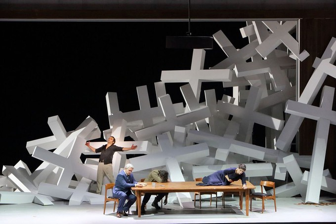 И драматургия спектакля Мартина Кушея в Баварской опере старательно (хоть и не всегда последовательно) протягивает невидимые нити от увертюры, во время которой нам показывают семейное застолье в режиме «стоп-кадра», ко всем остальным сложно перепутанным сюжетным перипетиям с пистолетами-самострелами, женщинами-монахами и парнями-рубахами, которые друг друга любят-ненавидят и на дуэлях истязают, точно Онегин с Ленским, только ещё хуже. В талантливом, но прямолинейном оформлении Мартина Цеетгрубера и Хайди Хакль (сплошное крестозасилье) вся драматургическая вата повисает совершенно не расшифровываемой головоломкой. Но блестящий ансамбль солистов компенсирует этот недостаток так же, как музыка Верди невообразимым образом «спасает» непристойно слабый сюжет.