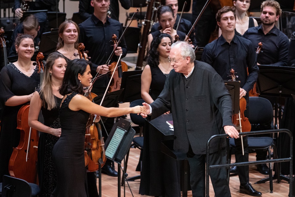 Чуть более собранно, но с теми же системными огрехами, прозвучал Брамс. Вновь читая язык дирижерских жестов: планировалось графично, подсушенно, с тонкими светотеневыми контрастами и впечатляющим финалом, где маэстро замедлил темп и начал поднимать из глубины партитуры угрожающие пласты меди. 74-летний дирижер вложил в исполнение огромное количество энергии, постоянно поворачиваясь к разным группам в оркестре, буквально подпрыгивая, вытаскивая фактуру, всем телом вопия к музыкальности и точности – в ответ же приходила молодая буйная энергия, пока не отшлифованная должным уровнем мастерства.