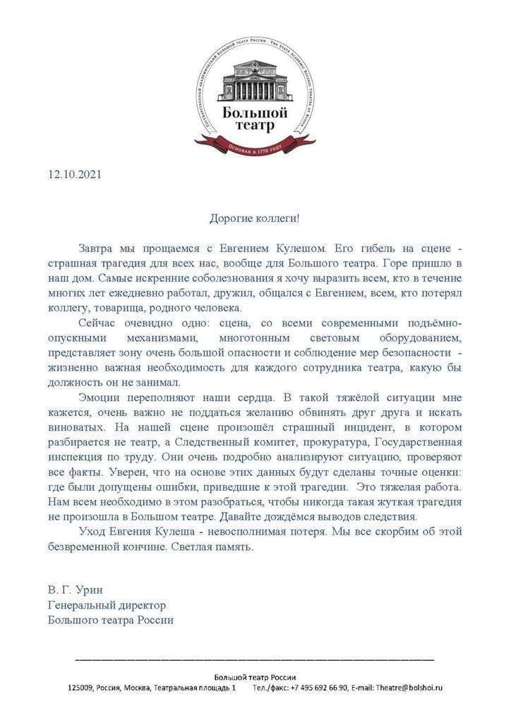 9 октября 2021 в Большом театре России во время представления оперы «Садко» погиб не просто артист миманса Евгений Кулеш: погиб мой коллега. Я сам много лет работаю статистом (тот же миманс) на Зальцбургском фестивале, несколько раз был травмирован в процессе подготовки спектаклей.