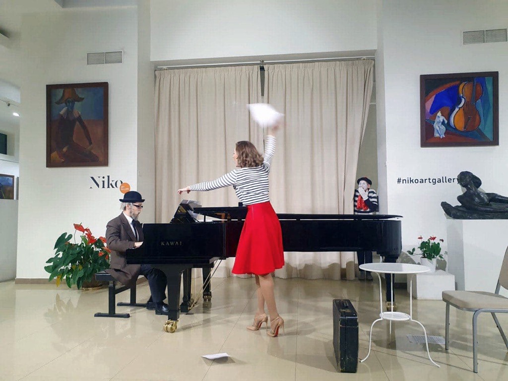 Она постоянно двигалась, взаимодействовала с трогательным мимом «душой Парижа» (тонкая пластическая и актёрская работа Петра Меркулова), рассказывая про «Бронзовую статую» и «Шляпника» Сати, и снова возвращаясь к Пуленку в «Галантных празднествах», «Апрельской луне» и «Отеле». Все первые семь номеров достаточно насыщенной фортепианной партии с почти импровизационным шармом сопровождал «дедушка»-пианист: в старомодном котелке, с седыми усами и бородой.