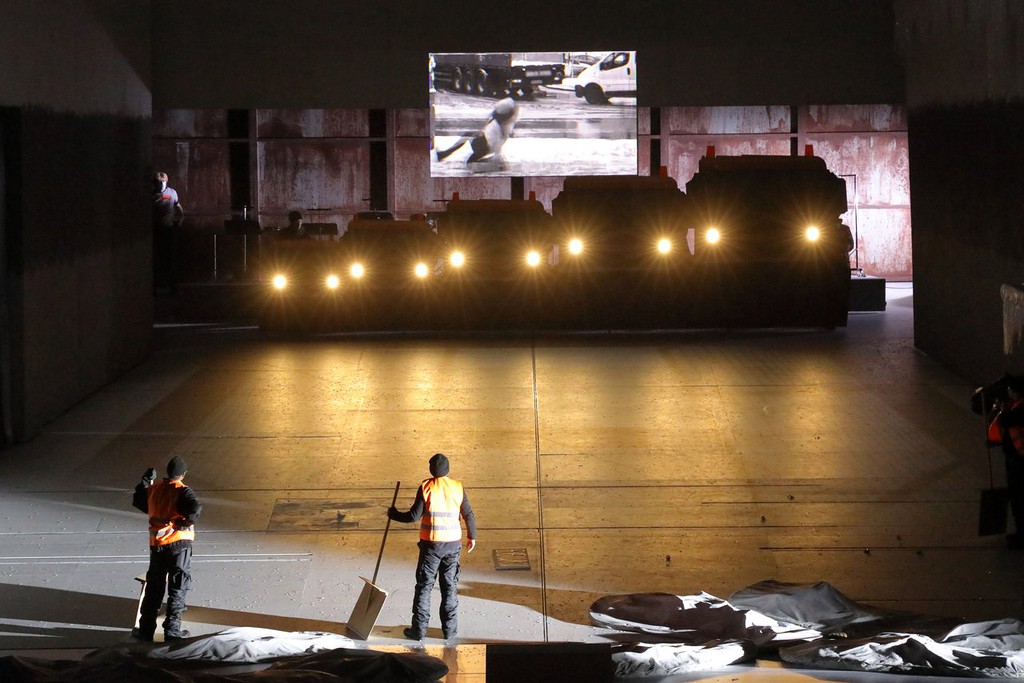 5) На общую концепцию постановки явно повлияло уголовное дело против режиссёра. По этой причине большая часть работы по подготовке спектакля велась невыездным из России Кириллом Серебренниковым в Москве и онлайн. Критика полицейского произвола красной нитью проходит сквозь весь мизансценный и оформительский нарратив постановки.