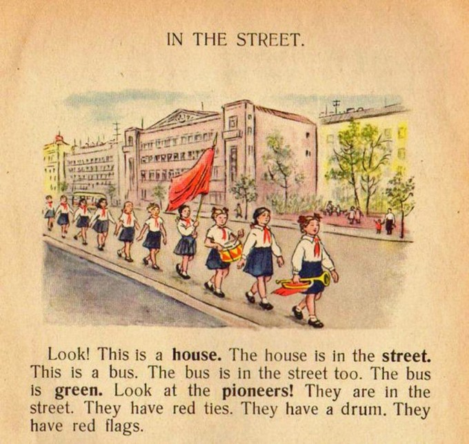 Отлично помню тусклый учебник, где почему-то рассказывалось о местном семействе Стоговых (The Stogovs), о Москве и комсомоле с пионерией, тогда как о самой Англии — с гулькин нос. Хотя, мы читали на уроках адаптированные отрывки даже из «Джейн Эйр», но могу допустить, что это была инициатива нашей англичанки. Инглиш — для общего развития, как пение с рисованием, но «ниже» истории с географией. Нынче принято ругать советскую систему образования за то, что «учила не тому» и не выдвигала ин-язы в число важнейших предметов. Мол, языковое обучение при Советах было сугубо элитарным, готовили господ-мажоров, а в школе через дорогу — пролетариев, говорящих на смеси мата и сопромата. Не так. Образование было целевым, а «элитарность» ему додумывали и — достраивали сами люди.