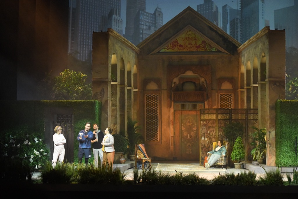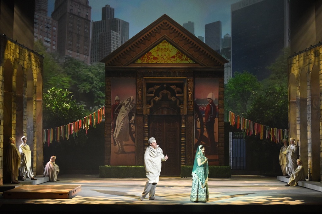 Режиссер сколотил команду единомышленников, в которую вошли Мария Высотская (художник-сценограф, художник по костюмам и гриму), Дмитрий Иванченко (художник-дизайнер видеопроекционной графики), художник по свету Руслан Майоров и хореограф Юлиана Малхасянц. С открытием занавеса перед нами – изумительно зрелищная картина. Перспектива заднего плана – видеопроекционное панно: урбанистический вид с башнями-небоскребами. Передний план – всё живописное пространство сцены, утопающее в зелени насаждений с индуистским храмом и прочими культовыми постройками. В каждом из трех актов сочетание уникальной перспективы города с уникальной локализацией в парковых владениях Нилаканты мастерски волшебно создает непреходящее зрелищное очарование.