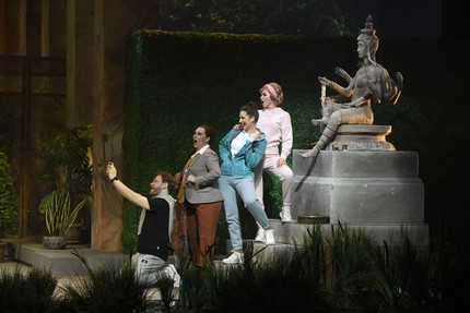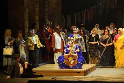 Поразительно органично в гардеробе спектакля сочетаются современный европейский покрой и национальные индийские костюмы. Туристы-европейцы, прихожане храма при Индуистском центре и служители религиозного культа в атмосферу преломленного в новом ракурсе сюжета вписаны идеально, и кульминация продуманной полистилистики костюмов во втором акте – не только массовая сцена праздника, но и ритуальные танцы. Из их большой сюиты в спектакль взяты лишь три номера, однако для создания живописного колорита наряду с изумительно стилизованными костюмами и смысловым видеоартом этого вполне достаточно. Видеоарт особенно захватывает в третьем акте: перспектива парка со зданием Индуистского центра перемещается на видеопроекционный задник, и мы видим вдалеке, как техника крушит это здание, окутывая его клубами белой пыли…