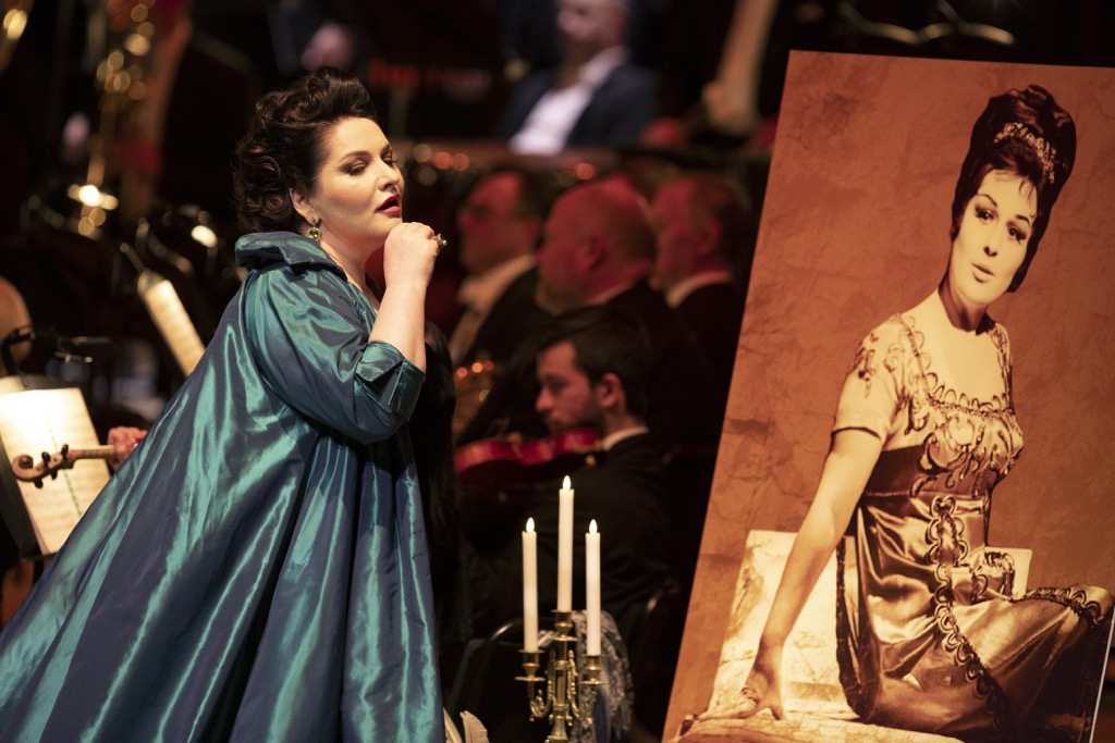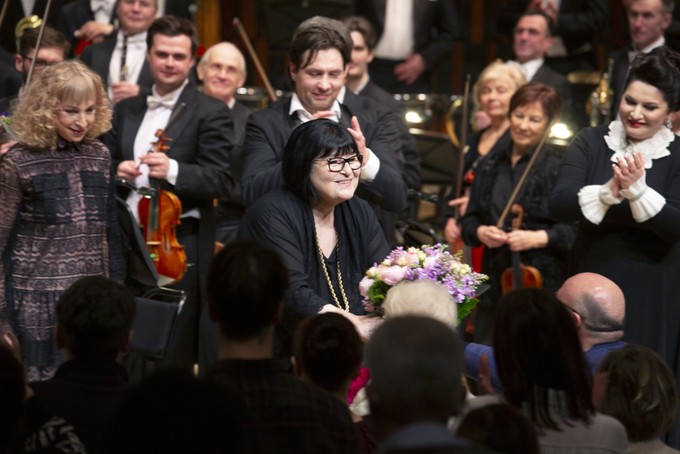 По сюжету оперы художник Марио Каварадосси – возлюбленный ревнивицы Тоски – списывает портрет Магдалины для храма со страстно молящейся в нём маркизы Аттаванти. Но насколько оригинально и точно при минимуме театрализации, придуманной в условиях концертного исполнения режиссером Ростиславом Протасовым, сей «портрет художника», ассоциирующийся теперь не с Магдалиной, а не иначе как с самóй Мадонной, попадает в цель, когда из-под скрывающей его портьеры предстает взору прекрасное архивное фото Маквалы Касрашвили в партии Тоски! Когда на сцене – ангажированная на этот проект солистка, а сама юбилярша – в зрительном зале, это создает неожиданно сильный эффект, так как просветленность «лика Мадонны», запечатленного на картине-фото, с эрзацем à-la glamour, созданным Хиблой Герзмавой, никакой корреляции не находит.