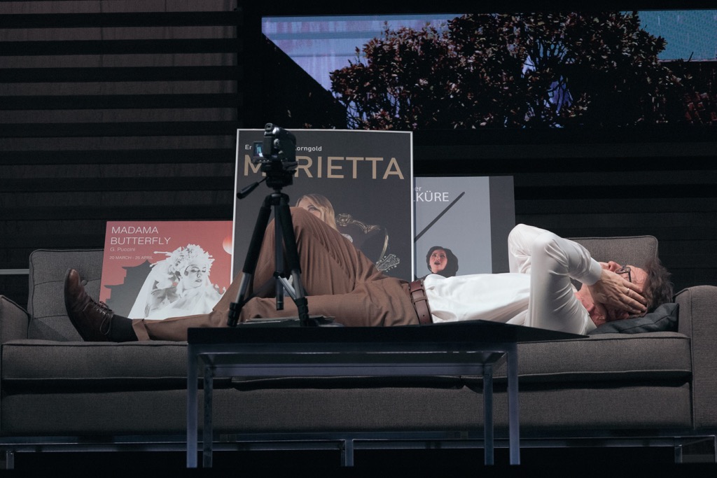 Во главе театрально-постановочной команды – Василий Бархатов, режиссер всегда, как правило, формальный, поверхностный, иллюстративный. Таким он предстал и на сей раз, но то, чем после довольно долгого перерыва он одарил, наконец, Москву, оказалось, как ни странно, «прелестным и милым», если так вообще можно говорить об оперном сюжете, в финале которого главный герой картинно топит свою «воскресшую» пассию в ванне, что, пожалуй, всё же «мягче и бархатнее», чем предписанное удушение либо удар ножом – тут всегда будут неизбежные разночтения. Но в идее режиссера ни смертей, ни «воскрешений» на этот раз нет: крен к триумфу жизни, к исходу из мёртвого города очевиден. У главного героя Пауля теперь нет умершей жены Мари, точнее есть живая, но бросившая его. А сам Пауль – пациент своего друга-психотерапевта Франка, постоянно ведущего видеозаписи их сеансов, и до того, как зазвучат первые такты музыки, публике как предысторию режиссер предлагает запись сеанса Франка с Мари и Паулем. И ее, уютно устроившись на диване, просматривает на экране главный герой, воскрешая в памяти болезненные воспоминания…